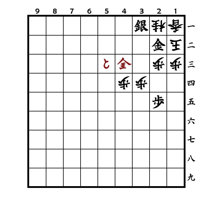Mit einem Gold auf4三 gestaltet sich die Sache nicht so einfach. Drei Silber sind für die Mattführung erforderlich. Nach dem Einschlag▲3二飛成 wird mit ▲4一銀 ein Silber geopfert und nach ▲5二銀 bringt im weiteren Verlauf▲3二金 die Entscheidung. Würde man hier statt des Goldes einen Silber einsetzen, folgt △2二玉 und es wird nicht matt. Wichtig ist in solchen Stellungen die Eroberung des Goldes auf 4三und weiter die Aufbewahrung eines Goldes für das finale Matt.