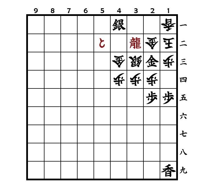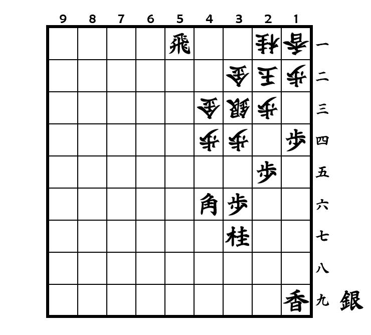 Auch hier ist ▲3一角 korrekt; nach △1二玉 würde dann wieder ▲1三角成 mit einfacher Mattführung folgen. Falls nach △3一同金 ▲同竜 der König den Drachen schlägt, entscheidet der Angriff ▲3二金 △同玉 ▲4一銀. Dann verbleibt am Ende noch ein Silber auf der Hand. In der Hauptvariante führt der durch die große Anzahl von Figuren auf der Hand abgesicherte Angriff nach ▲2一竜 zum Erfolg. ▲2四桂 bringt schließlich die Entscheidung.