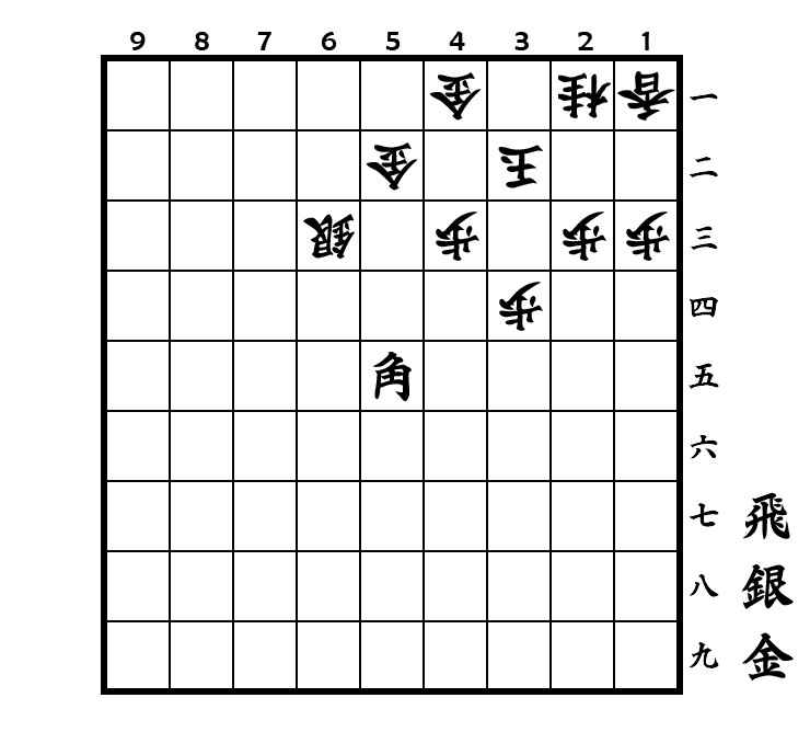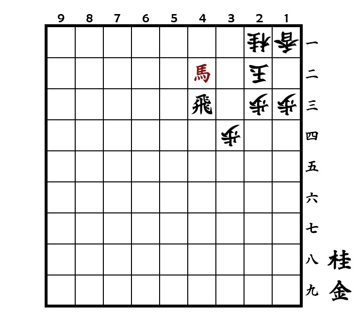 Weil hier ein Silber auf 1三 steht, funktioniert die Kombination mit ▲2三飛成 nicht. Aber da die Position des Turms um ein Feld nach links gerückt ist, führt das Opfer ▲3二馬 gefolgt von ▲4四桂 zum Erfolg. Falls darauf △4二玉geschieht, bringt ▲4三金 ein schnelleres Matt. Nach △2二玉 dagegen muss mittels ▲3三金 der Fluchtweg nach oben verbaut werden. Denn ohne diesen Zug entwischt der König nach ▲5二飛成 über das Feld 3三.