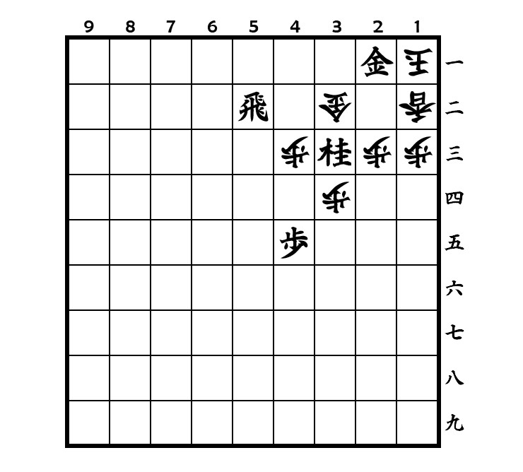 Aber △2二玉 geht es nicht weiter. Falls Sente in der Anfangsstellung jedoch Gold, zwei Silber und einen Springer